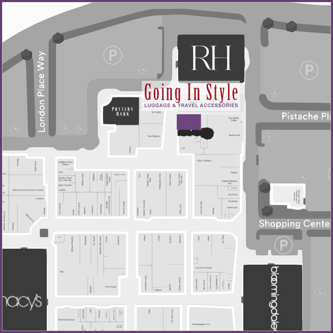 Going In Style Luggage Store is located South of Burlingame, CA at Stanford Mall near Restoration Hardware next to J. Jill