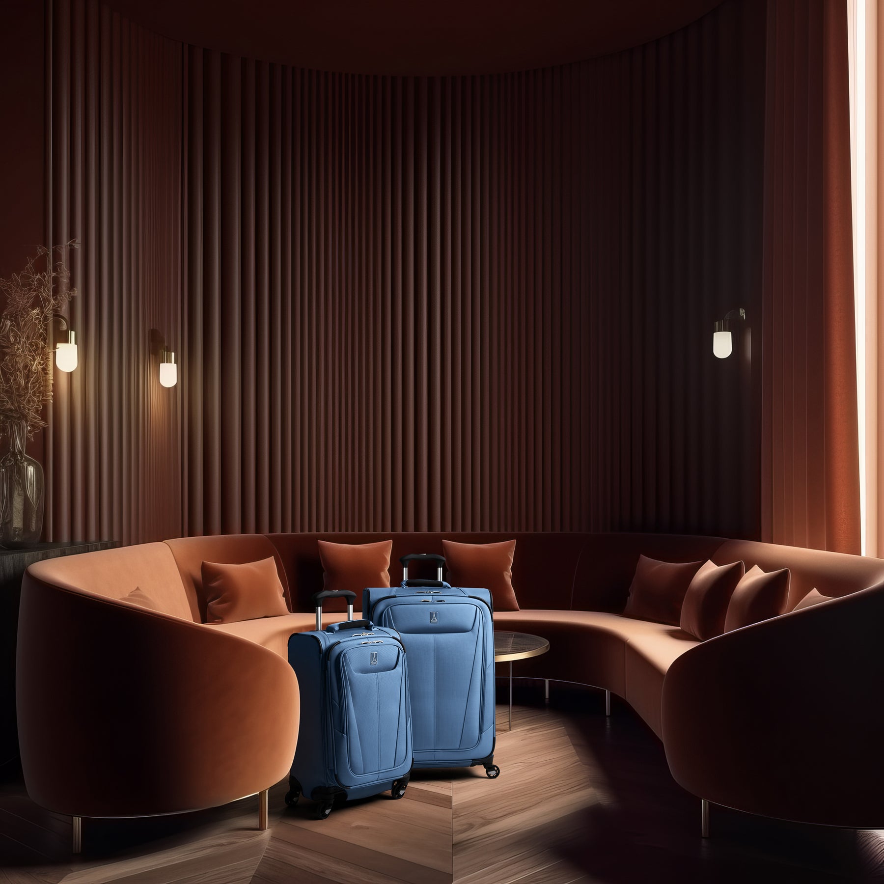 TravelPro Maxlite® 5 Medium Check-In Spinner next to matching carry on in color blue sitting in hotel loby